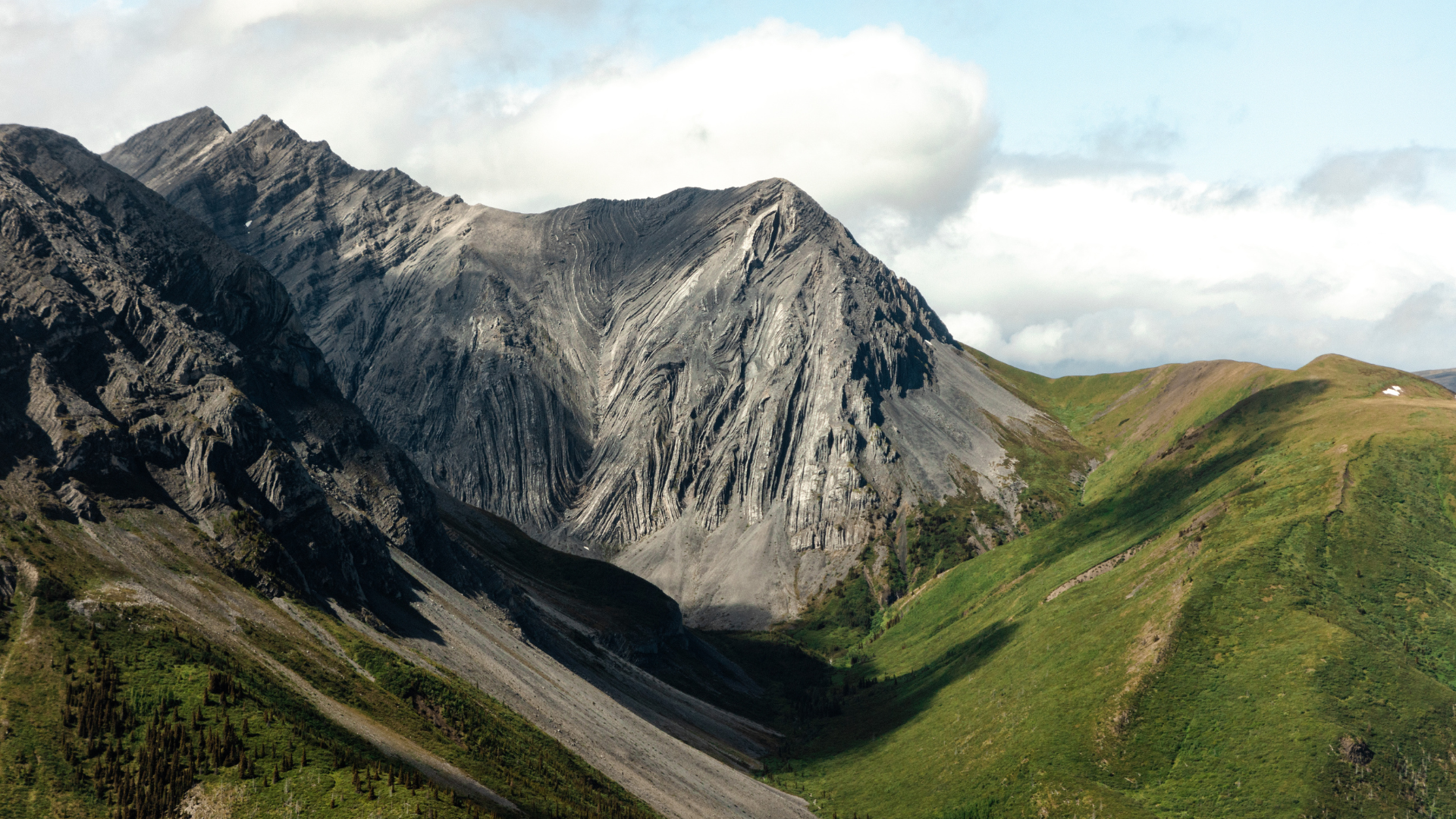 ID: Mountain peaks with geological lines and green grassy slopes in Dene K'eh Kusan