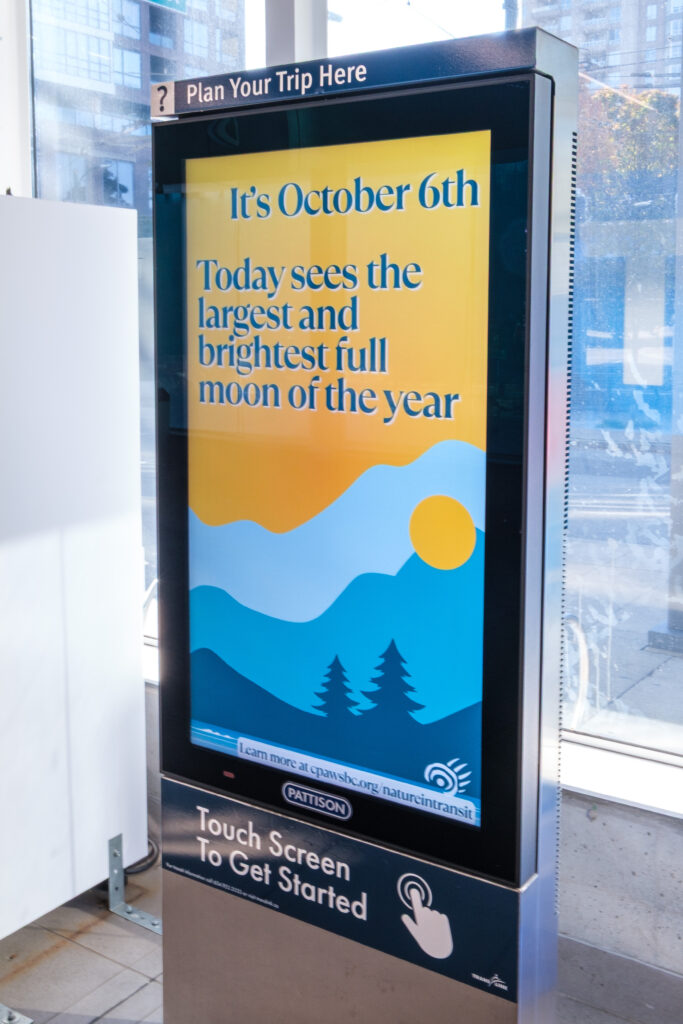 Experience Nature in Transit for yourself! Between Oct 6 – Nov 3 you can find a new daily feature at several SkyTrain stations, including Commercial Broadway, Granville, Burrard, Joyce, Scott Road, Vancouver City Centre, Waterfront, Yaletown, and Lansdowne. Go get on transit & check it out, or view the gallery of past features below!